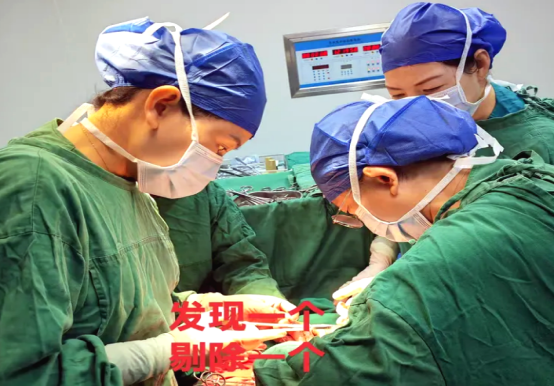 “这里还有一颗,深度约2厘米。”话音刚落,助手张盼盼、赵勤勤立刻调整患者子宫位置,配合充分暴露病灶,麻醉医生同步密切监测患者血压,确保在剔除小肌瘤的过程中,保证患者生命体征始终平稳。时间一分一秒地流逝,一颗、十颗、二十颗……大大小小的肌瘤被陆续取出。术中,医护人员的额角均渗出了汗珠,他们却始终保持着稳定、规范操作的神态。当最后一颗细小的肌瘤被成功剔除,清点数目时,在场所有人感到前所未有的震撼——一共48颗。