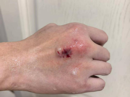 该患儿因手臂功能恢复不佳,需要加强康复训练。当日返院复查时,孩子因训练疼痛产生强烈抗拒,低头咬住了任常明的右手背。