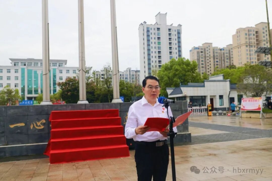 细雨未减热忱,淮滨县人民医院班子成员及职工代表精神抖擞,齐聚广场,举行升旗仪式,副院长吴树山主持仪式。