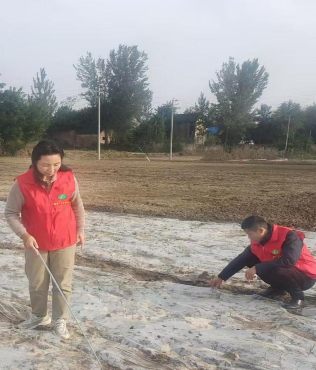 今年他们主要种植农作物大蒜已经发芽,地膜还需要人工扣开。计生特殊家庭蒋成旺老两口为空巢老人,家里年轻人都在外务工,缺乏劳动力。老两口平时在当地偶尔打打零工,还种植了十余亩大蒜,由于今年雨水大,种植的大蒜被雨水冲了还要扶一扶,协会志愿者也都亲身体验了一番,帮助他们干些力所能及的活儿。