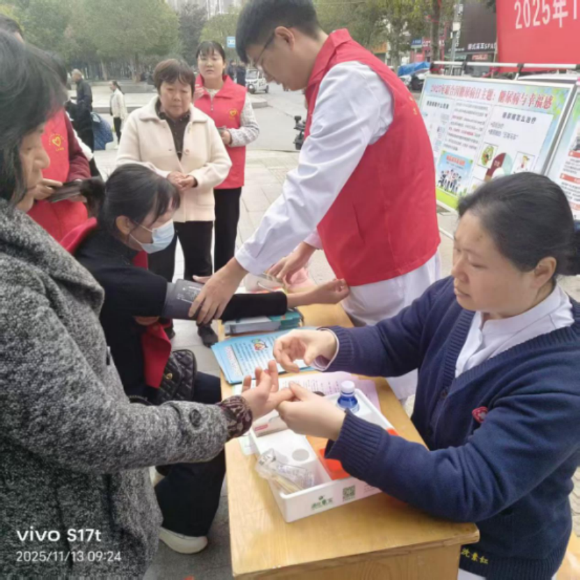活动现场,医护人员通过设立宣传展板、发放健康手册等方式,围绕“糖尿病与幸福感”主题,向居民生动科普糖尿病防治知识。从“五驾马车”的综合治疗原则,到日常饮食管理、科学运动的实用建议,讲解内容贴近生活、通俗易懂。义诊团队还免费为群众提供了血糖检测、血压测量等服务,并针对个体情况耐心解答各类控糖疑问,给予个性化健康指导。