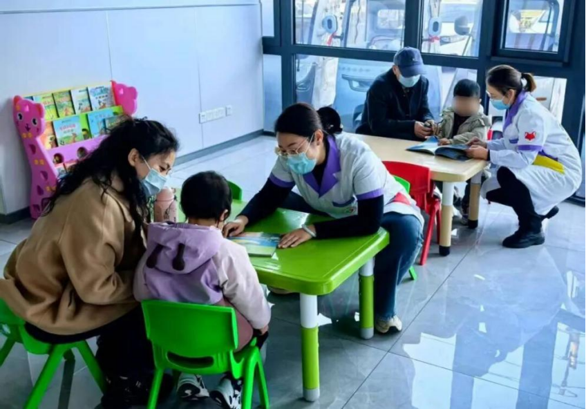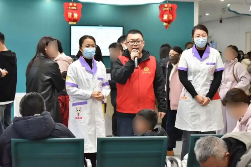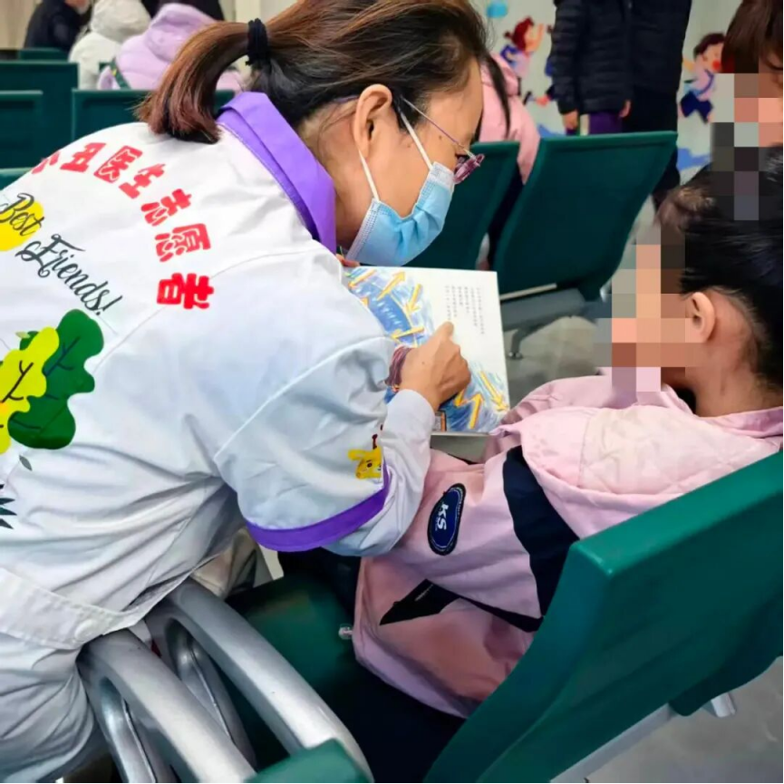 “小丑医生”捧着《小蝌蚪找妈妈》的绘本绘声绘色地讲了起来。“小蝌蚪游啊游,嘴里喊着‘妈妈,妈妈,你在哪里呀?’”她们模仿着小蝌蚪软糯的语气,配上夸张的表情,一下子把孩子们的注意力都拉了过来。有的孩子凑到绘本前,指着画面里的青蛙妈妈大声喊:“我知道!它们的妈妈是青蛙!”还有的小朋友学着小蝌蚪的样子,晃着身子“游”来“游”去,候诊区里的笑声此起彼伏,原本藏在孩子心里的就诊紧张感,早被这欢乐的氛围冲得一干二净。