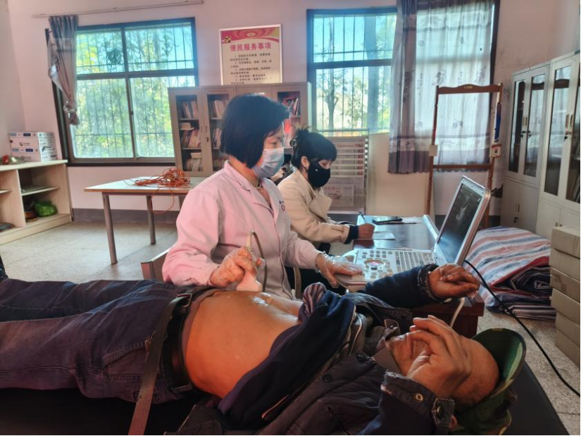 为帮助村民全面掌握自身健康状况,医疗队携带便携式医疗设备,免费提供血压血糖检测、心电图检查、B超筛查等辅助检查服务。医护人员操作规范细致,一边为老人检查,一边耐心询问身体情况,第一时间将检测结果反馈给专家,实现“筛查-诊断-指导”一站式服务,有效推动常见病、慢性病的早期筛查与干预。