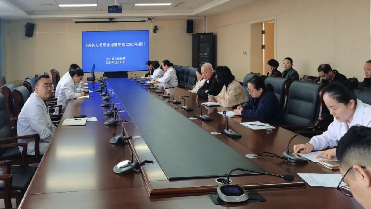 2025-11-16 来源:医药卫生网 - 医药卫生报 浏览:次医药卫生网讯(记者王明杰 通讯员张宇扬 裴仁宇)为进一步强化全院医务人员纪律意识、规矩意识和作风建设,全面提升职业道德水平与医疗服务质量,11月14日,光山县人民医院组织开展《医务人员职业道德准则(2025年版)》学习活动。