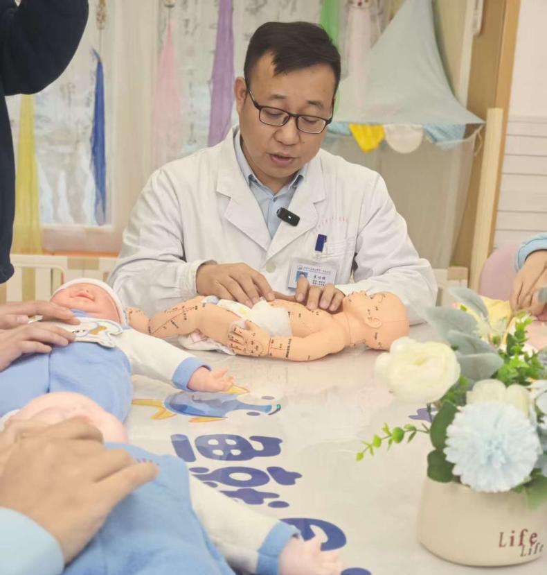 李付根聚焦0岁~3岁婴幼儿常见的消化问题,分为“婴幼儿腹胀应对”和“小儿厌食调理”两大主题。在腹胀专题分享中,李付根重点从中医角度解析了婴幼儿腹胀的成因。中医认为,“积滞”和“脾胃虚弱”,小儿“脾常不足”,喂养不当易导致乳食停聚、气机不畅,引发腹胀哭闹。针对这一问题,李付根现场演示了摩腹、揉板门、运内八卦等简单易学的小儿推拿手法,详细讲解了操作要领、力度控制和时间要求,并介绍了排气操、飞机抱、多趴着等辅助排气方法,强调了科学喂养、腹部保暖等日常护理要点。在随后的“小儿厌食调理”交流中,李付根说,0岁~3岁婴幼儿厌食现象普遍,主要分为非疾病因素(喂养不当、饮食习惯差、脾胃功能薄弱等)和疾病因素(锌缺乏、消化不良、口腔疱疹等)两类。他强调,家长需警惕厌食伴随的腹胀、反酸、口腔疼痛等症状,持续1周~2周无改善应及时就医排查疾病。针对非疾病性厌食,李付根推荐了足三里、中脘穴、脾经、捏脊等推拿穴位,现场演示了准确取穴和操作手法。现场,家长和托育老师们围绕居家护理边界、推拿注意事项、饮食搭配等问题积极提问。