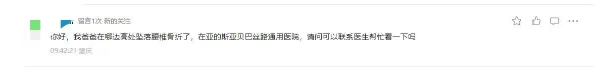 11月27日,16:37分,“河南援外医疗”公众号小编在处理后台留言时,突然看到一条发于当天早上的一条评论和私信:你好,我爸爸在哪边高处坠落腰椎骨折了,在亚的斯亚贝巴丝路通用医院(实际是丝绸之路综合医院,小编注),请问可以联系医生帮忙看一下吗