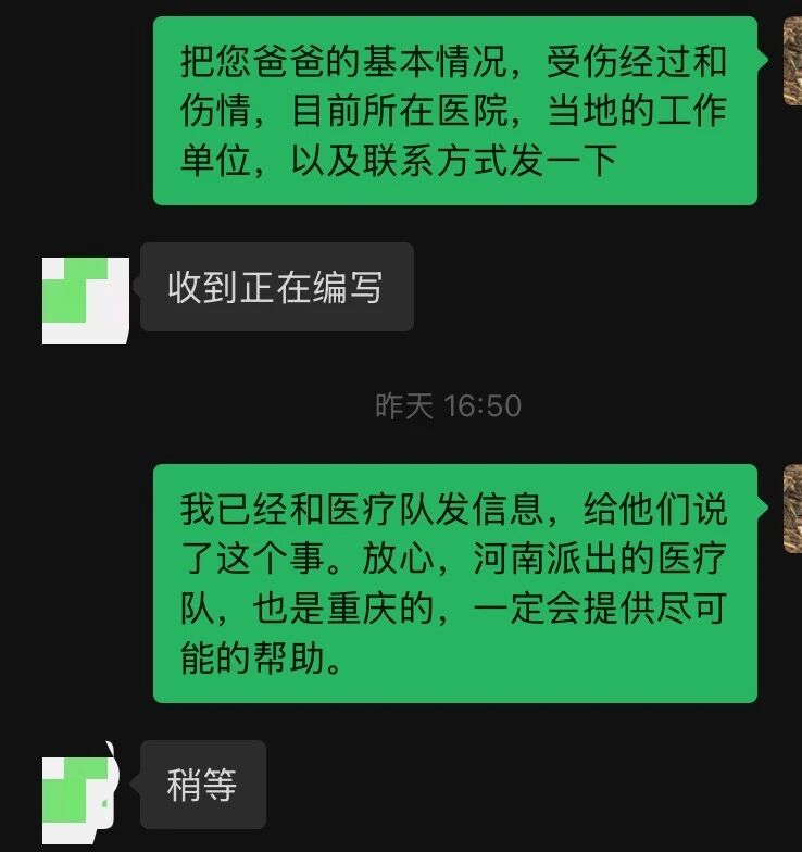 常年和援外医疗队打交道,小编很了解有同胞在当地受伤时家人的焦躁,立刻给其留言:请留下联系方式方便沟通。
