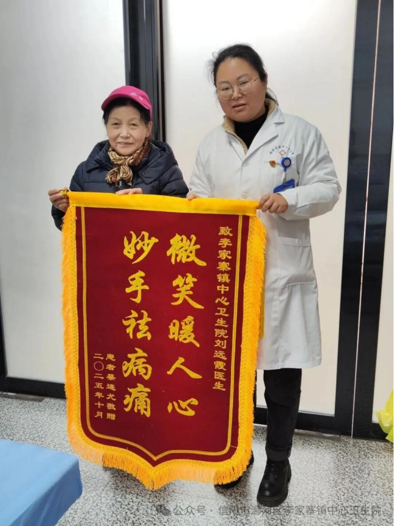 2025-12-5 来源:医药卫生网 - 医药卫生报 浏览:次医药卫生网讯(通讯员林姝君 邓莹莹 吴正泽)近日,信阳市浉河区李家寨镇中心卫生院刘远霞医生的诊室里,迎来了一份温暖的“礼物”——患者家属送来的一面锦旗。上面绣着“微笑暖人心,妙手祛病痛”十个金色大字。