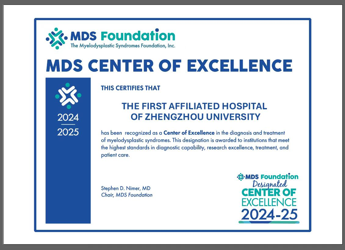 郑大一附院血液科荣膺国际MDS基金会“全球卓越中心”认证