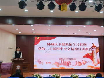 2025-12-21 来源:医药卫生网 - 医药卫生报 浏览:次医药卫生网讯 12月18日,漯河市郾城区卫健系统学习贯彻党的二十届四中全会精神宣讲报告会在郾城区中医院举行,孟庙镇卫生院高度重视、精心部署,选派彩超室闫若琳、办公室王润涛两名优秀职工作为宣讲代表参会,以基层视角传递全会精神,用实干故事诠释医者担当,凭借精彩表现获得与会人员广泛好评。