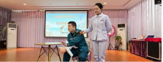 讲解结束后,准爸妈们轮流上台练习。“以前只在视频里看过,今天亲手练过,心里真正有底了。”
