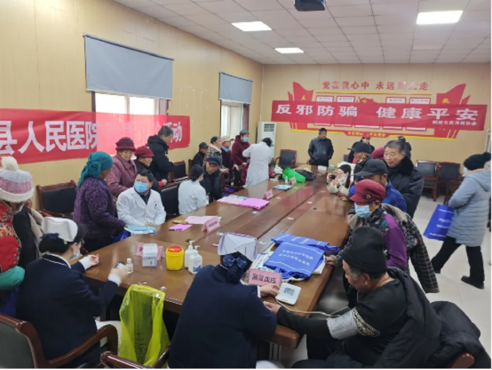 活动现场,医护人员与政法委、科协工作人员协同配合,通过悬挂横幅、发放宣传手册等方式,为村民送去“健康+平安”的双重守护。针对农村地区多发的“养老诈骗”“保健品诈骗”及邪教渗透等现象,工作人员用当地方言结合真实案例,生动揭露诈骗手法与邪教危害;医护团队同步为村民提供血压、血糖测量及常见病咨询等义诊服务,并围绕慢性病防治、日常保健等内容开展健康科普,引导村民树立“科学防病、理性防诈”的理念。