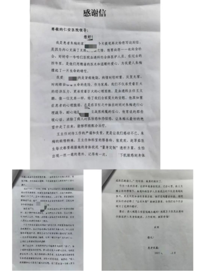 由于朱女士病情特殊,常规治疗方案无法完全适配,王文鹏便带领医生郭春玲、张欢欢、赵翠茹等,根据她每次的身体指标变化,“量身定制”个性化透析方案,每一个细节都反复推敲,确保治疗安全有效。李先生在感谢信中特意提到,有一次朱女士刚完成透析下机,突然出现身体不适,王文鹏第一时间赶到床边,全程陪伴观察,嘘寒问暖,直到症状缓解后,还亲自将她送上回家的车,这份细致与负责让家属倍感安心。