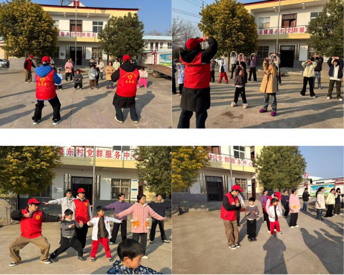 随后,中医健康科普环节正式开启。漯河医专中医学院青马班成员化身健康导师,带领村民和孩子们一同习练我国传统养生功法——八段锦。师生们分成多个小组,采取“一对一”示范教学的方式,将“双手托天理三焦”“左右开弓似射雕”等八个招式逐一拆解,手把手纠正村民的姿势。八段锦动作简单易学、效果显著,这场别开生面的教学,不仅传授了实用的健身方法,更化作一堂生动的中医文化启蒙课,让传统养生智慧深入人心。