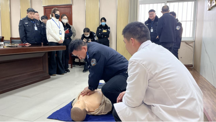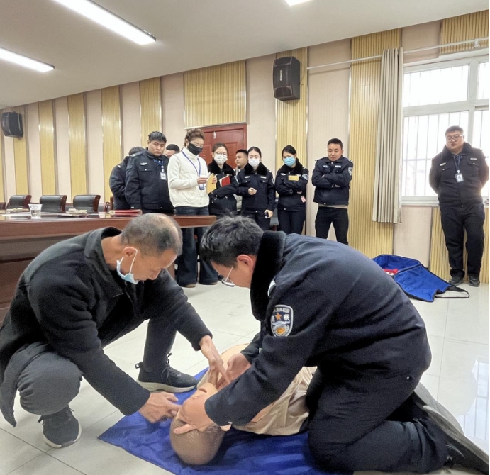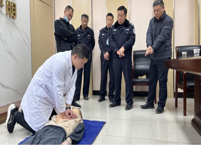 卫生院医生结合民警工作强度大、应急任务多、可能直面群众突发疾病的特点,采用理论讲解与情景模拟相结合的方式展开。理论部分,医生系统阐述了心肺复苏(CPR)的重要性、适用场景、完整操作流程:包括环境评估、意识判断、呼救、胸外按压、开放气道、人工呼吸等关键步骤及注意事项,特别强调了“黄金四分钟”的救援理念。同时,针对高血压这一常见慢性病,详细讲解了高血压急症(如高血压危象)的识别要点、现场初步处理原则、安全用药常识以及避免不当搬动等风险防控知识。