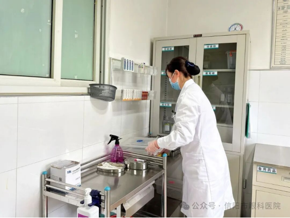 眼科病区护理人员则对治疗室的药品柜、操作台进行细致消杀,整理各类医用耗材,严格落实院感防控要求,为患者打造安全、放心的诊疗环境。