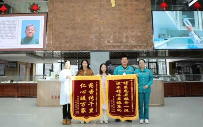 这份在关键时刻获得的“暖心照护”始终被章女士铭记于心。为表达由衷的谢意,她特意定制了两面锦旗,“情系患者服务一流,医术精湛医德高尚”的金色大字,是对急诊科全体医护人员精湛技术与高尚医德的生动写照;而“药香传千里,仁心暖万家”的赞誉,则饱含了对药房工作人员专业、亲切服务的诚挚肯定。这不仅是对科室工作的最高褒奖,更是对召陵区中医院整体服务水平的充分认可。