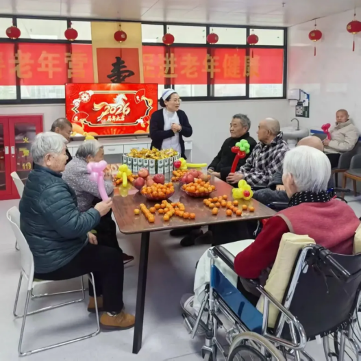 活动现场暖意融融,喜庆十足。红彤彤的装饰将养老院装扮得格外温馨,桌上摆放着新鲜的水果、软糯的糕点和清香的热茶,每一处细节都透着浓浓的年味和对长辈们的关怀。老人们早早便来到活动现场,老朋友们相见,热情地打招呼、拉家常,脸上洋溢着幸福的笑容。