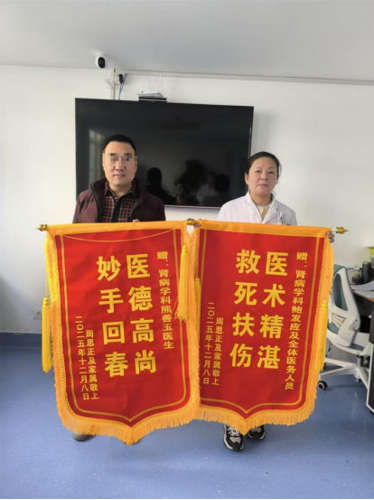 临出院前,患者家属特意送上锦旗,对肾病学科团队,特别是熊善玉精湛的医术、高度的责任心以及护理人员无微不至的关怀表示由衷的感谢。这面锦旗不仅是对肾病学科团队医疗技术水平和服务质量的肯定,更是医患之间互信互敬、共克病魔的珍贵见证。