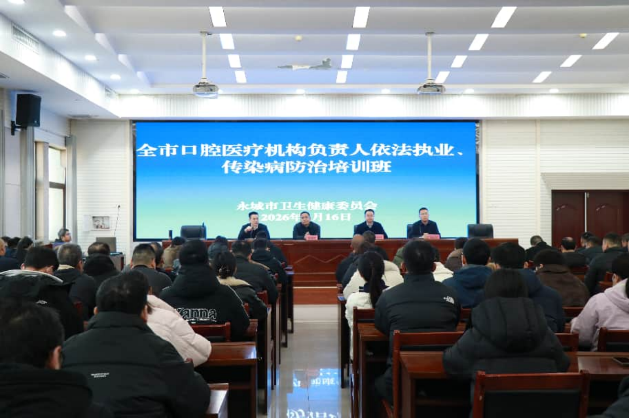 2026-1-16 来源:医药卫生网 - 医药卫生报 浏览:次医药卫生网讯(记者赵忠民 通讯员高思杰)为进一步规范口腔诊疗服务秩序,筑牢医疗质量安全防线,切实保障群众口腔健康权益,1月16日,永城市卫生健康委组织召开全市口腔医疗机构依法执业暨传染病防治培训会议。市卫生健康委主要领导出席会议并作动员讲话,辖区内设有口腔科的综合医院、乡镇卫生院、民营医院负责人,以及个体口腔门诊、诊所负责人和卫生监督执法人员等150余人参加培训。