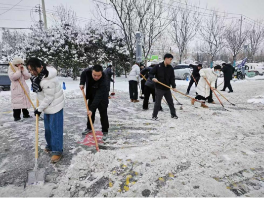 清扫现场,大家分工协作、干劲十足,有人挥舞铁锹破冰除雪,有人手持雪铲清扫路面,有人配合铲车打通主干道,还有人在门诊楼前、住院楼通道等重点区域铺设防滑物资。