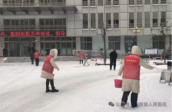院领导强调,必须确保“生命通道”绝对畅通,确保各项措施落实到位。多措并举,筑牢院内安全防线医院迅速行动,组织人员在门诊大厅、急诊通道、住院部出入口等关键区域铺设防滑垫,设置“小心地滑”警示标识,安排专人引导。在院区主干道、坡道等重点部位撒布融雪剂,严防路面结冰,为步行就医的患者筑起第一道安全防线。主动出击,为“生命通道”清障开道清雪工作的重点,不仅在于“走路”,更在于“通车”。
