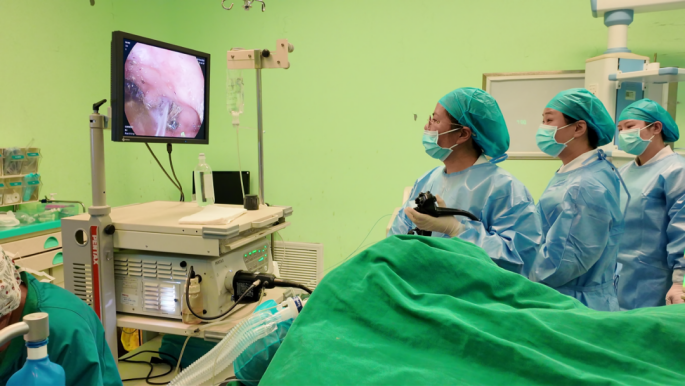 患者早年接受过食管癌切除手术治疗,其胃部位置相较于普通人更接近胸腔,如果采取开刀取石的方式,则势必要打开胸腔,创伤大、风险高;且患者的胃结石质地较硬,住院期间采取的碳酸饮料溶石治疗等保守治疗方式均无法让结石消融排出。面对复杂病情,医院迅速启动多学科诊疗(MDT)模式,组织普外科、泌尿外科、内镜室、麻醉科专家进行会诊。经全面评估,团队最终为患者量身制定了“内镜下钬激光碎石”的微创手术方案。