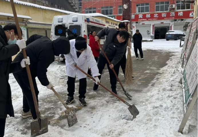 大家分工协作、干劲十足,有的挥锹铲雪,有的奋力扫积,有的撒布融雪剂,不放过任何一处易滑路段。冰冷的雪花落在肩头、融化在眉间,却挡不住大家的热情与担当。经过数小时的奋战,一条条干净整洁、安全通畅的就医通道被顺利打通,为前来就诊的患者筑起了一道“温暖防线”,让这个极寒冬日里多了一份安心与暖意。