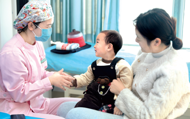 “抓抓宝宝的小手手,再抓宝宝的小手手……”1月17日,在孟州市中医院,护士崔璐正在为患儿进行推拿。据了解,为帮助患儿早日恢复健康,该院医务人员根据患儿病情,走进病房为有需要的患儿开展推拿等服务,并为孩子家长普及小儿推拿相关知识。 王正勋 侯林峰 郭雪莹/摄
