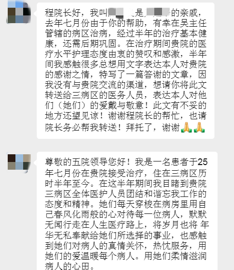 陈先生自2025年7月入院以来,在该院三病区医护团队的精心诊疗与悉心照料下,身体状况逐渐好转,各项指标稳步恢复。这份跨越半年的陪伴与守护,让陈先生深受感动,通过院长微信,诉说心中的感激之情。