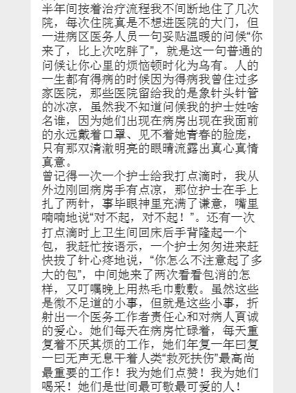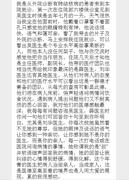 2026-1-27 来源:医药卫生网 - 医药卫生报 浏览:次医药卫生网讯(记者王明杰 通讯员沈佩)信阳市第五人民医院1月27日介绍,一直以来,该院始终秉持“以患者为中心,以质量为核心”的服务理念,用精湛的医疗技术、优质的护理服务,守护着一方百姓的健康。近日,该院院长微信收到患者陈先生的感谢信,这份特殊的“礼物”,字里行间满是对结核科呼吸三病区全体医护人员的认可与感恩,也承载着患者对医院的信任与肯定。