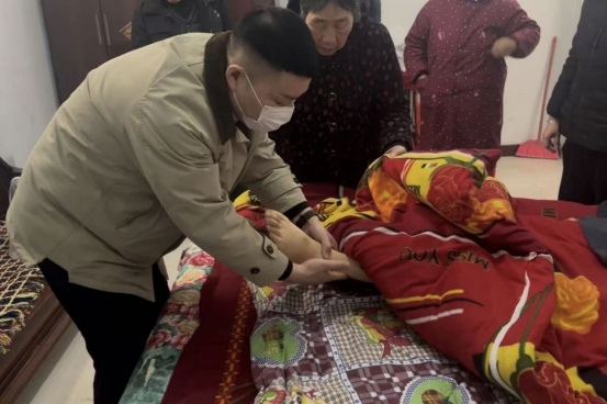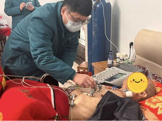 天寒地冻,挡不住医者前行的脚步。高景法亲自带队,带领诊疗团队迎着寒风如约登门,抵达患者家中后,团队成员立即分工协作、有条不紊地开展诊疗工作:为患者细致监测生命体征、完成心电图检查、开展血液检验,凭借丰富的临床经验精准判断病情发展态势,及时调整个性化治疗方案。诊疗结束后,团队成员还针对患者脑出血术后康复特点,为家属系统普及居家康复护理要点,手把手指导翻身、拍背、基础护理等实操技巧,耐心解答家属在日常照护中遇到的各类疑问,用专业的讲解、细致的服务,为家属吃下“定心丸”。