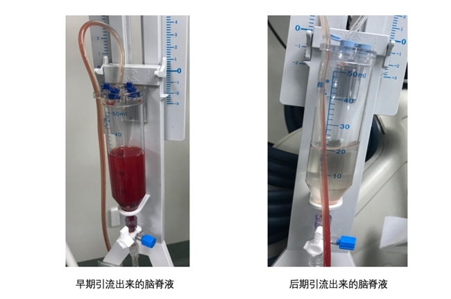 据介绍,脑池造瘘术的步骤是:开放颅底脑池,分离Liliequist膜,清洗脑池并放置引流管,释放含有血源性代谢物的脑脊液。“大脑每天都会产生新的脑脊液,这些干净的脑脊液会替代被引流至体外的脑脊液。从临床看,早期引流出来的脑脊液都是血性浑浊的,后期引流出来的脑脊液要清亮很多。这些血性脑脊液含有大量的有害物质”,王永红教授表示。