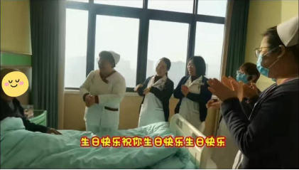 寿星朱先生,因左腹部疼痛,左后腰部疼痛,伴左下肢膝关节以上麻木收住老年医学科治疗,星期三早晨,科内医生、护士长在查房时得知当天是朱先生70岁生日,考虑到家属都远在外地的特殊情况,就商量着给他筹备“特殊的生日”。全科医护人员周密计划,利用空闲时间将精心准备的生日蛋糕送到了宋先生的手里,“朱伯伯,生日快乐!愿这份小温暖能给您添点力量,盼您早日康复!”护士长许晓宁递上全体医护的祝福,她说,医院追求的不只是医疗技术的精准,更想把“人”放在心上,关注患者的不安与期待,送上家人般的关怀,这份温情,本就是帮助患者康复的重要力量。在医护人员的簇拥下,朱先生脸上绽放出惊喜的笑容,连声道谢:“没想到住院还能过生日,你们真是太有心了!”