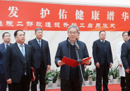 张天增在致辞中说,近年来,市委、市政府始终把保障群众就医需求、提升医疗服务水平摆在重要位置,锚定健康濮阳建设目标,持续推动医疗资源提质增效。濮阳市人民医院作为全市医疗卫生服务体系的中坚力量,紧贴群众就医需求,对住院二部进行系统改造提升,既是盘活存量资源、补齐服务短板的务实举措,更是深化医药卫生体制改革、推动医疗服务高质量发展的生动实践。住院二部的焕新启用,将有效缓解群众住院就医压力,为广大患者提供更舒适、安全、高效的诊疗服务,对构建优质高效的医疗卫生服务体系、满足群众日益增长的健康需求具有重要的现实意义。希望市人民医院以此为新起点,以“硬件升级”带动“软件提质”,持续提升诊疗技术与服务品质,让新环境、新设施真正转化为群众看得见、摸得着的就医获得感,努力打造党和政府放心、人民群众满意的现代化医院。