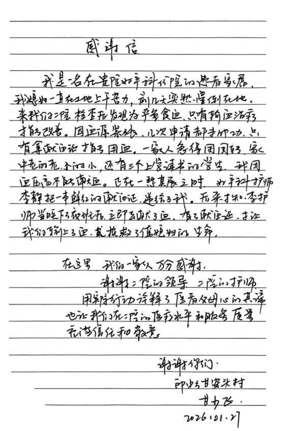 近日,一封情真意切的感谢信送到了濮阳县第二人民医院。信中,患者家属甘先生讲述了一段发生在该院的暖心故事:其妻子因严重贫血急需用血,家人却因故无法提供所需凭证。危急关头,医院妇产科护师李静毫不犹豫地拿出自己的献血证,解了燃眉之急,帮助患者顺利获得救治。