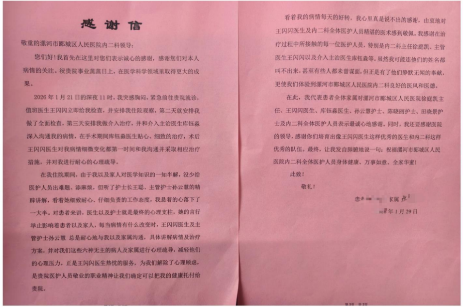 2026-1-31 来源:医药卫生网 - 医药卫生报 浏览:次医药卫生网讯(记者王明杰 通讯员张敬林)近日,漯河市郾城区人民医院接连收到一份来自出院患者的特殊致谢。患者张先生在康复后,不仅向该院领导及内二科寄去情真意切的感谢信,还主动致电12345市长热线,实名表扬救治过程中的多位医护人员。这一系列温暖的举动,折射出一段关于生命救治与医患深情的感人故事。
