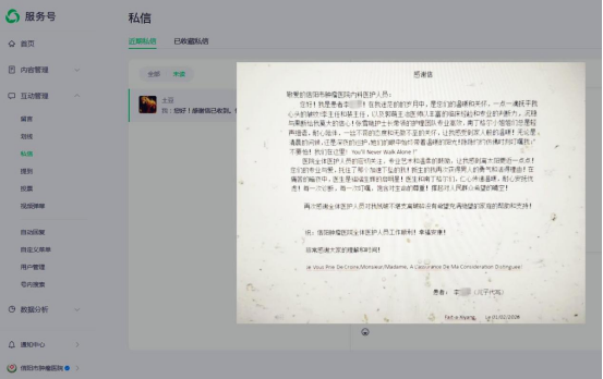“在我迷茫的岁月中,是你们的温暖和关怀,一点一滴抚平我心头的皱纹……你们的专业与爱,托住了那个加速下坠的我。”2026年2月1日,信阳市肿瘤医院微信公众号后台收到一封情真意切的感谢信。