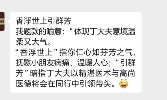 “香浮世上”,是家属眼中丁鑫尧的仁心。家长说,你的仁心如芬芳之气,抚慰小朋友病痛,温暖人心。在儿科,哭闹声与焦灼的询问声交织,而丁鑫尧总是那个让人安定的存在。听诊前她会下意识搓热掌心,扎针时她会弯下腰柔声安抚。那些日复一日的耐心,不张扬,却如梅香般沁入人心。许多患儿家长说,看到丁鑫尧,心里就踏实了。