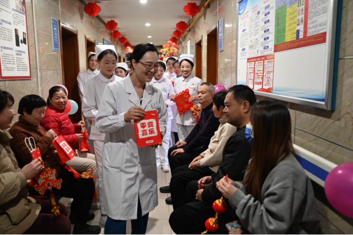 春节将至,2月13日,开封市中心医院内分泌科通过开展为住院患者赠送节日小礼品、举办医患联欢会等活动,使患者感受到浓浓的节日氛围下的人文关怀。图为该科室的医患互动活动。王新光/摄