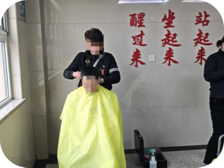 理发师们轻声细语地与患者沟通需求,手中的剪刀、推子灵活运转,动作娴熟又轻柔。对于行动不便的患者,他们将“理发点”设在床边,避免患者奔波。一把小小的剪刀,剪去的是烦恼与不便;一次贴心的服务,传递的是关爱与希望。
