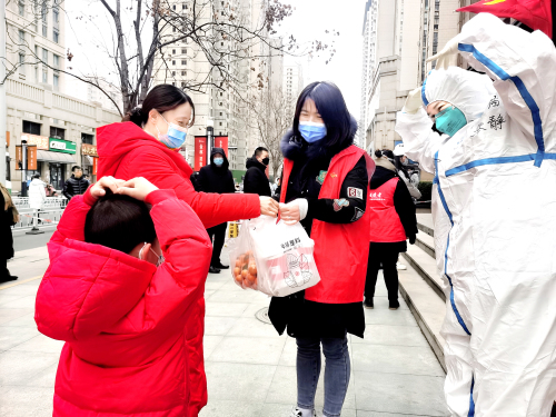 在金水区未来路金林中心核酸检测点,热心市民为河南省肿瘤医院的医务人员送来奶茶和水果
