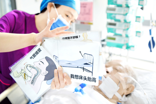 河南省人民医院中心ICU(重症监护室),护士在使用卡通图与患者沟通