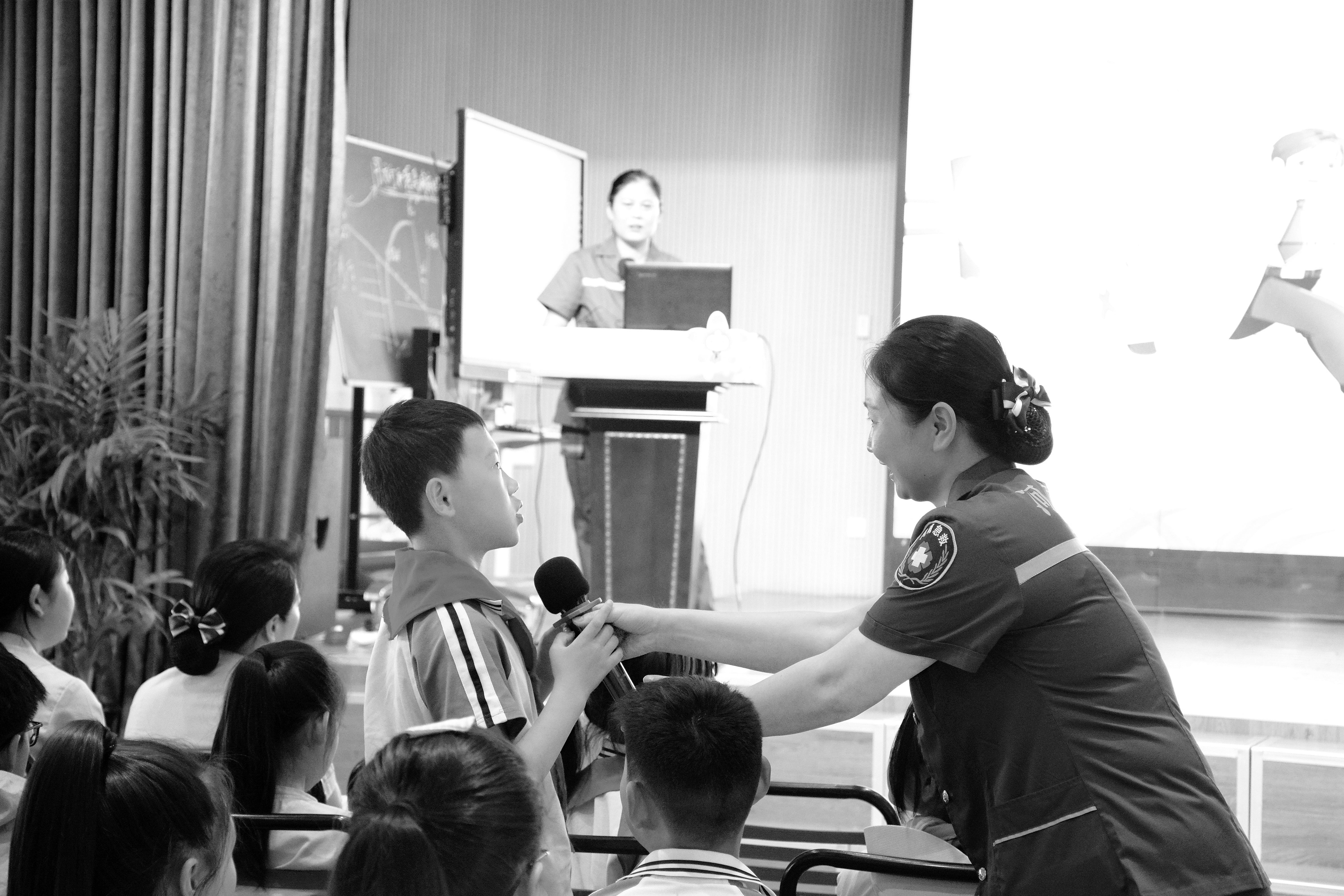 6月10日,在许昌中医院卫生应急知识技能培训活动现场,学生回答急救人员提出的急救问题。当天,许昌中医院组织急救人员走进许昌市毓秀路小学开展卫生应急知识技能培训活动,全面普及预防、避险、自救、互救等应急知识,进一步增强广大师生应急能力。 王正勋 侯林峰 王学成/摄