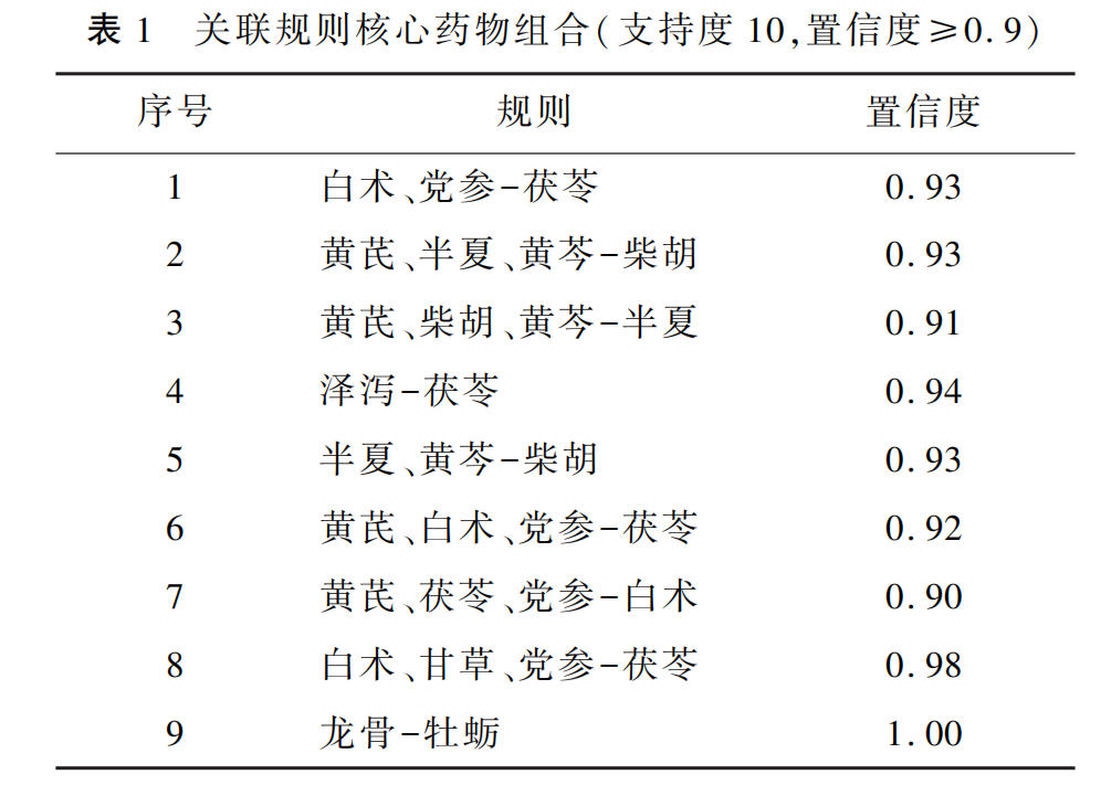 关联规则分析统计方剂中药物组合的出现频次,支持度表示药物组合同时出现的概率,置信度表示前项出现条件下后项出现的概率。笔者对225份处方进行分析,设置支持度个数为10、置信度为0.9,按药物组合频次由高至低排序,得到核心药物组合,包括“白术、党参-茯苓”“黄芪、半夏、黄芩-柴胡”等(如表1);将核心药物组合进行网络化展示,可清晰归纳出刘同坤常用方剂,如四君子汤、柴胡加龙骨牡蛎汤、黄芪建中汤等。