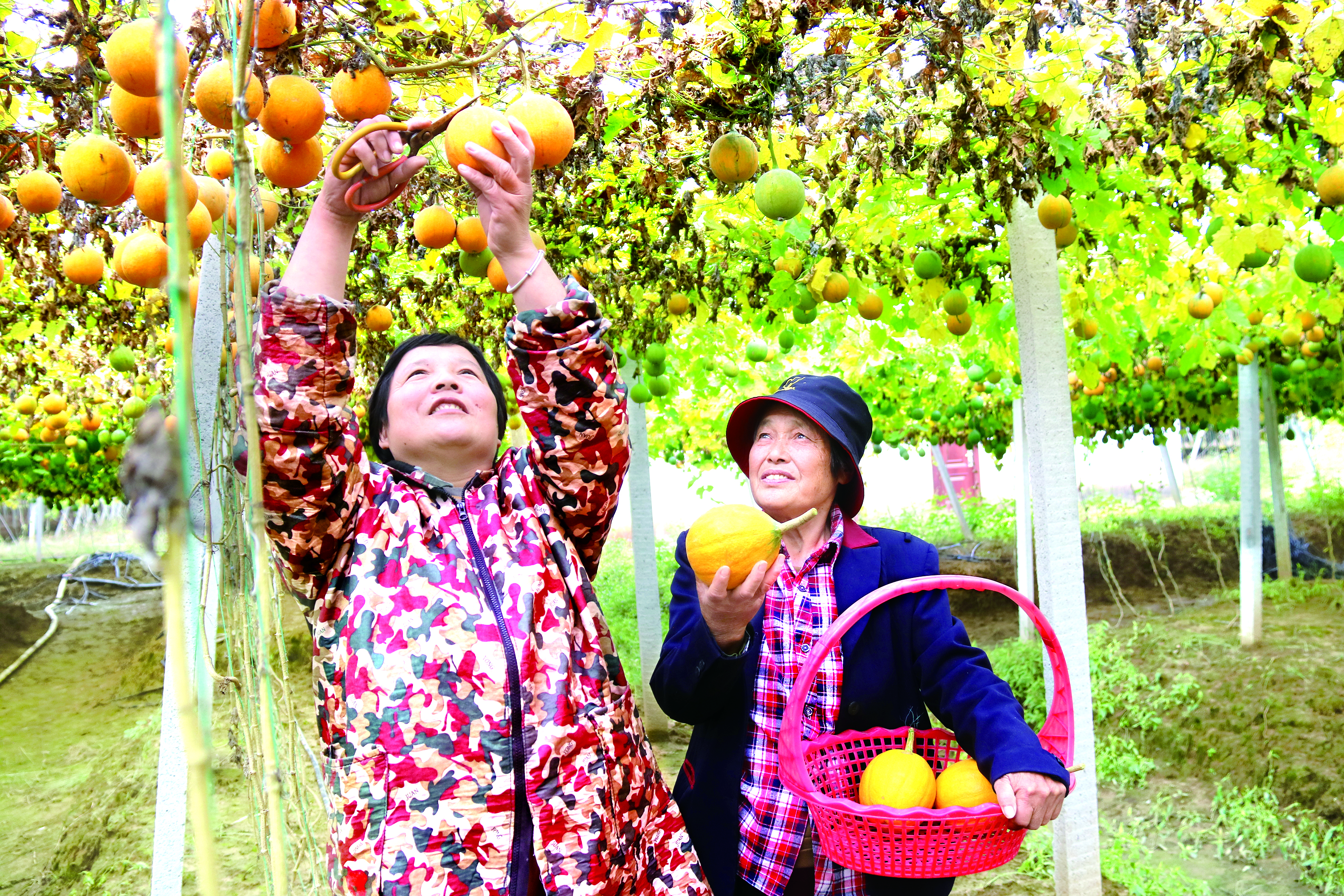 在舞钢市刁沟村瓜蒌特色种植基地,村民采收瓜蒌