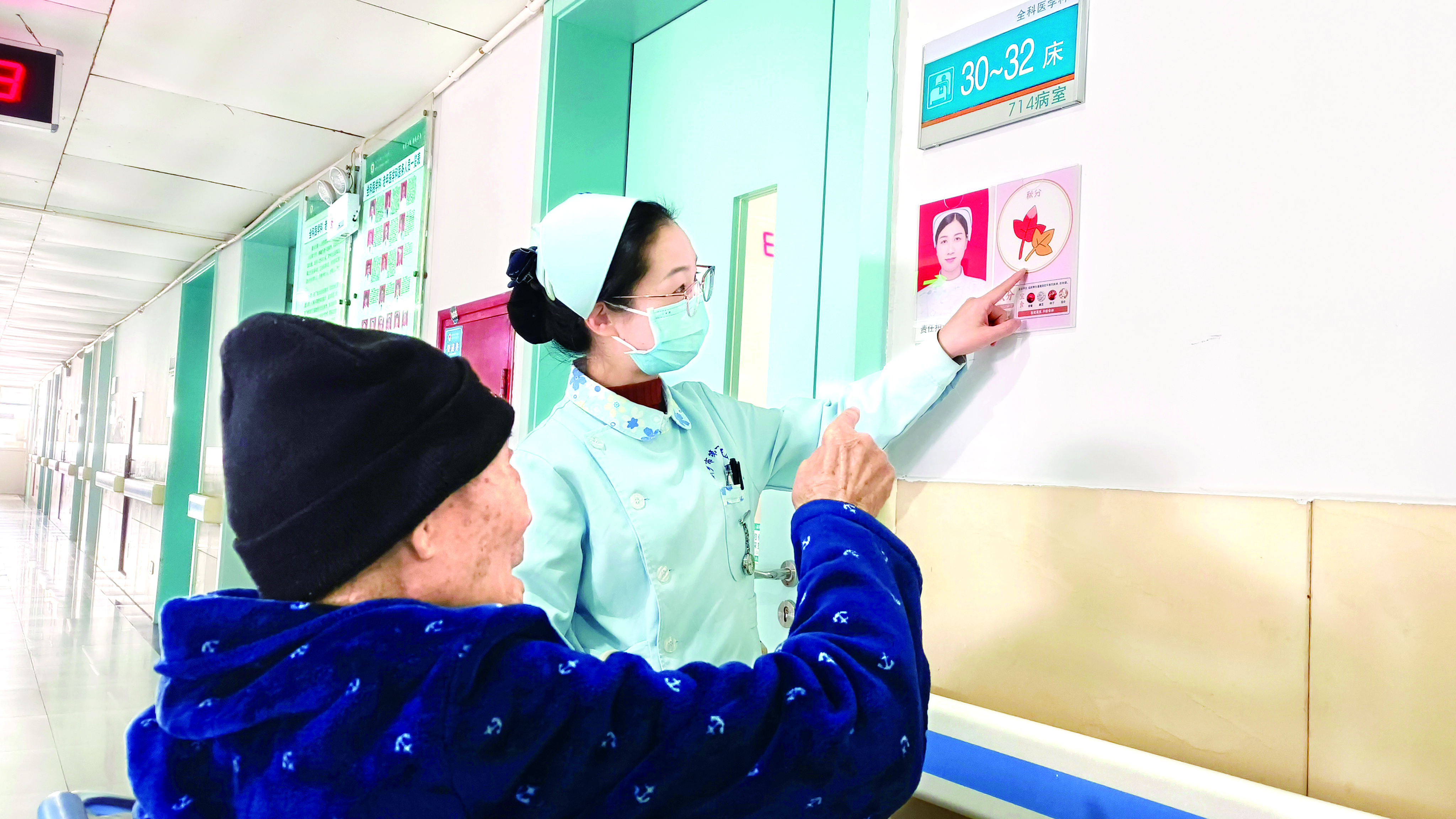 11月22日,在新乡市第一人民医院全科医学科,护士正在告知患者所住的节气病房。该科以中国24节气为灵感,为每间病房设计了专属节气主题图案。色彩鲜明、辨识度高的图案张贴在病房门口,既解决了老年患者“记房号难”的困扰,又传递了健康养生理念。 常俊伟 宋瑞芳/摄