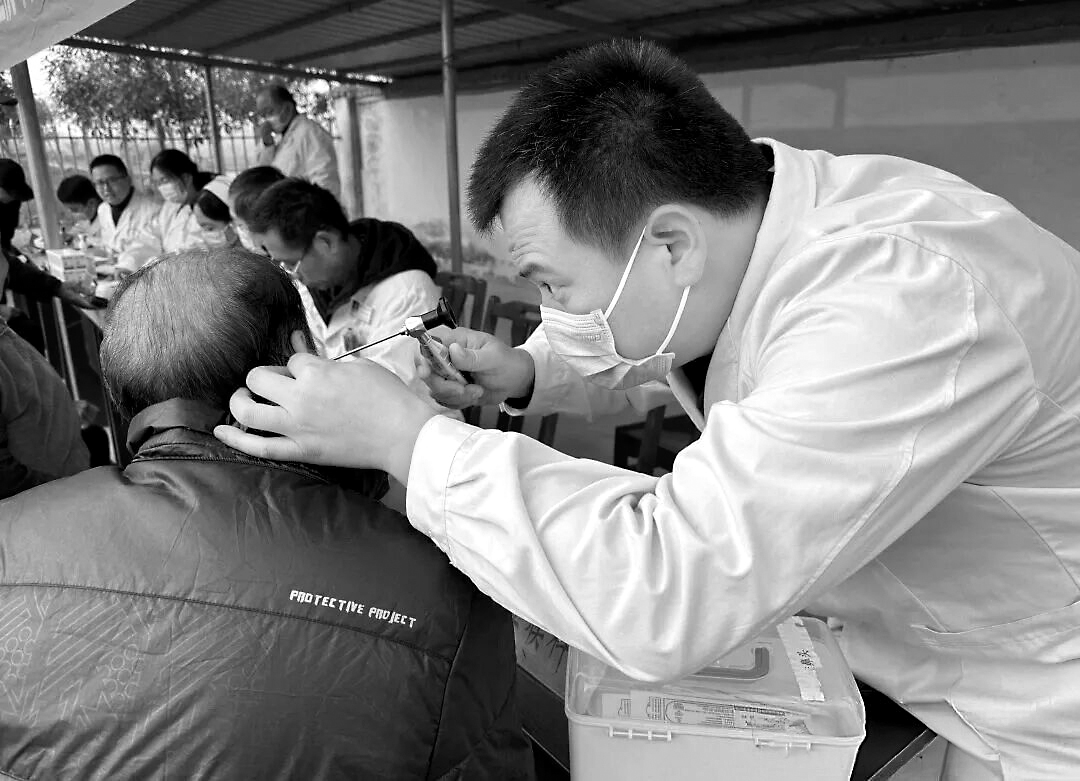 ↑12月11日,在淮滨县芦集乡项营村党群服务中心,医务人员为群众检查听力。当天,淮滨县人民医院到芦集乡项营村开展“百医进百村”健康义诊暨卒中防治宣讲活动,让群众足不出村便能享受到县级医疗专家的精心服务和健康指导。 王明杰 熊 丽/摄
