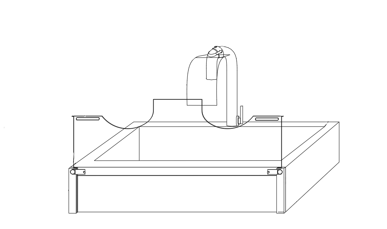 水槽挡板顶部为凹凸结构,其中部为半圆形凹陷。水槽挡板顶部两侧各设有一个拉手,共计两个,便于医护人员通过拉手控制水槽挡板上下移动。