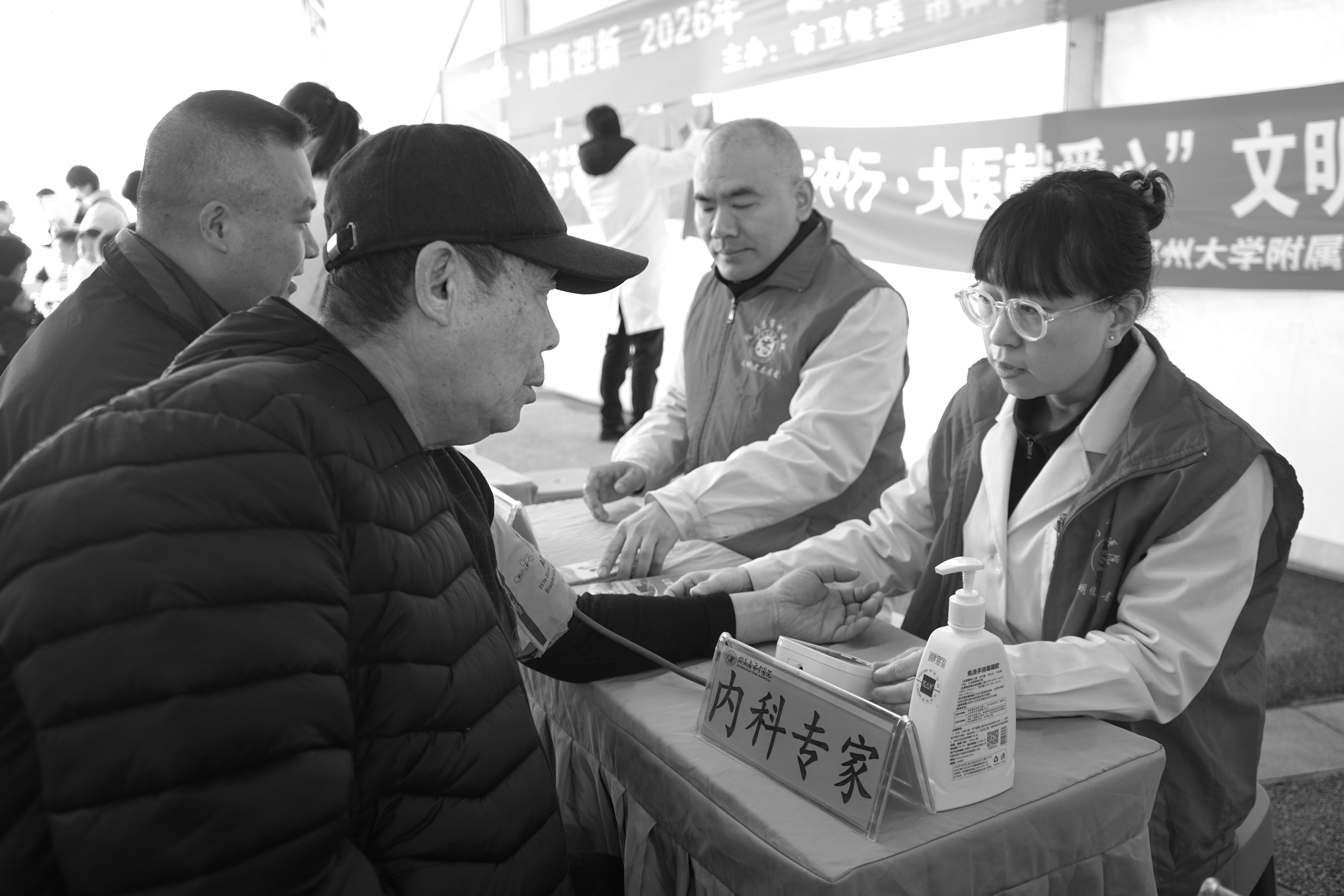医务人员为群众测量血压